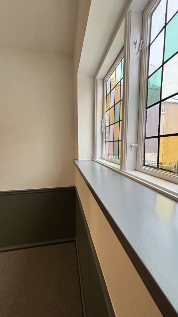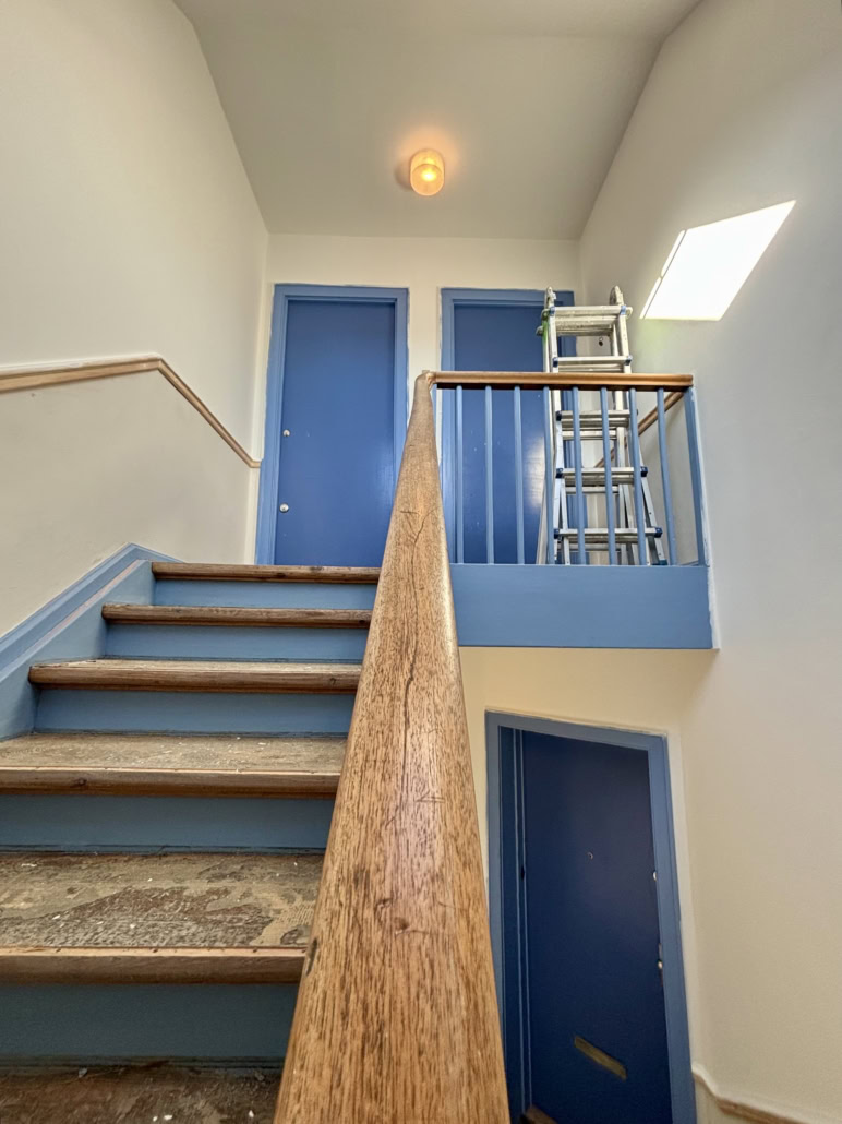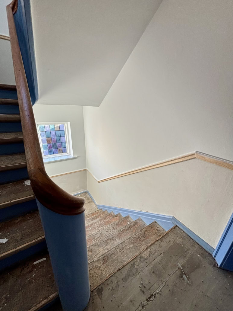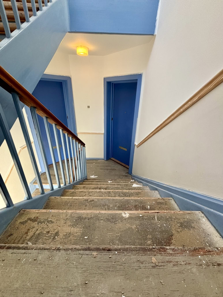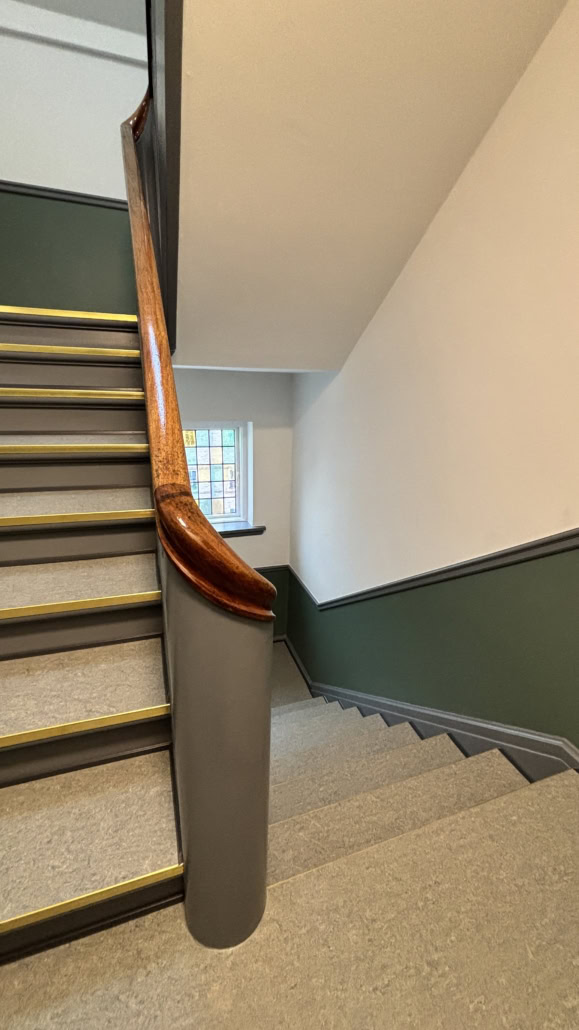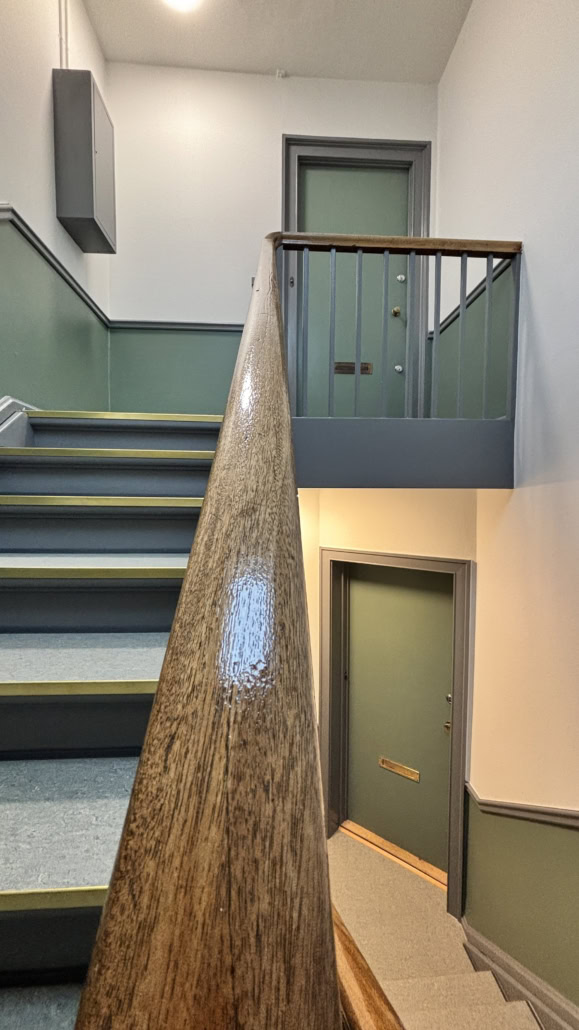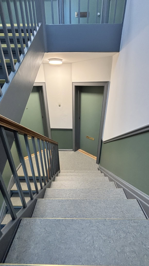 Trapperne fik nye fenderlister, istandsatte vægge, lofter og træværk samt nye linoleumsgulve med messingskinner på trinforkanter. Samtidig blev belysningen opgraderet med energieffektive LED-armaturer for bedre lys og øget tryghed.
