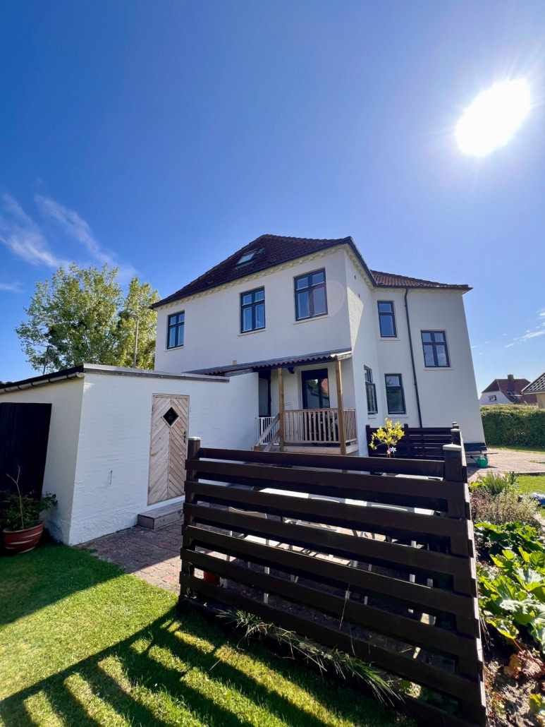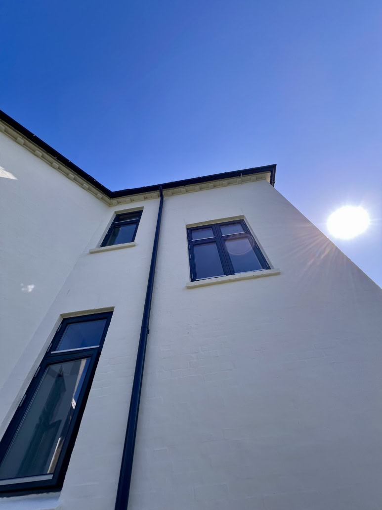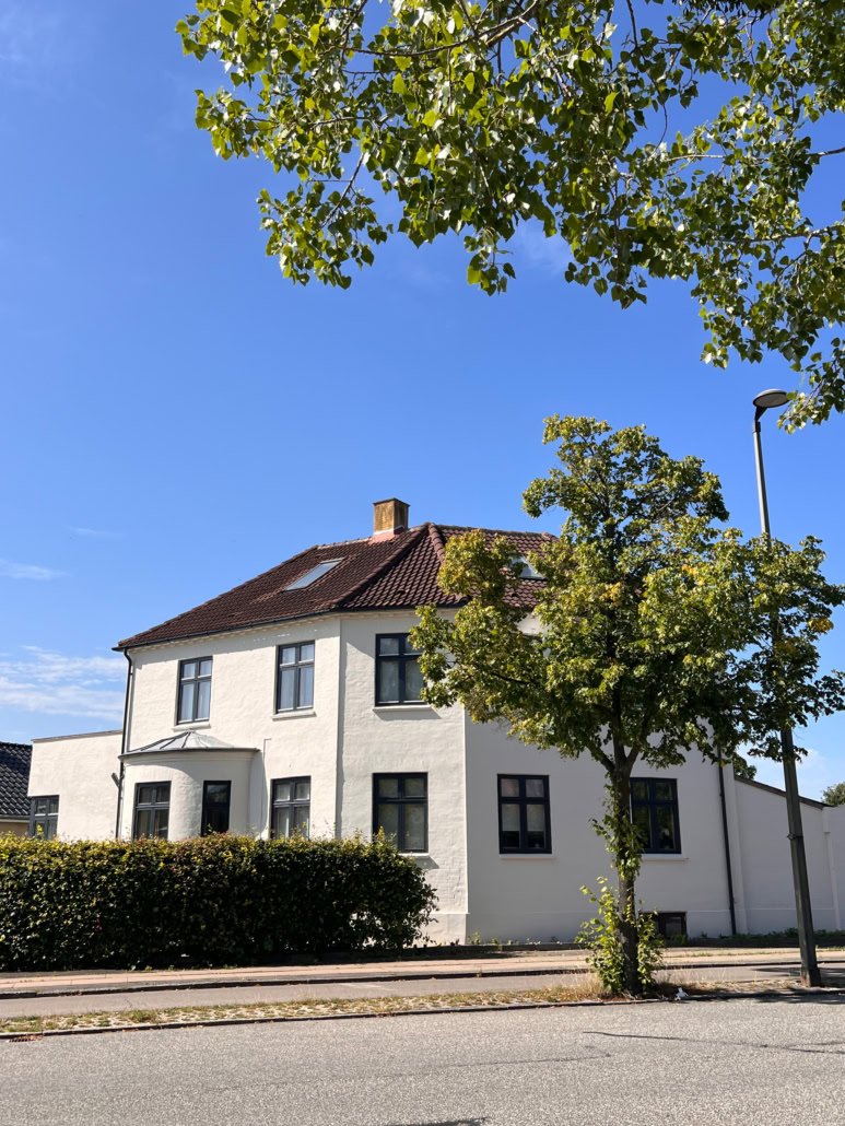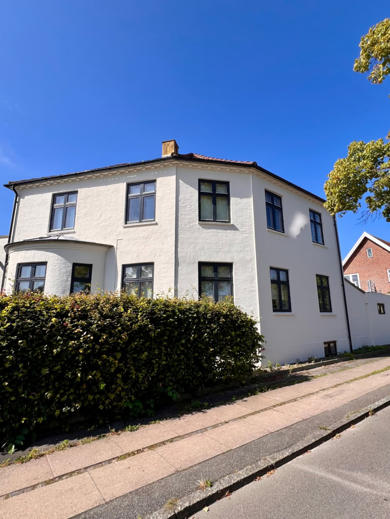 Facaderenoveringen på denne privatvillalejlighed omfattede: Udskiftning af løse sten, reparation og armering af sætningsrevner, filsreparation, hedvandsrens, maling af hele facaden i silikatmaling og malerbehandling af vinduer.