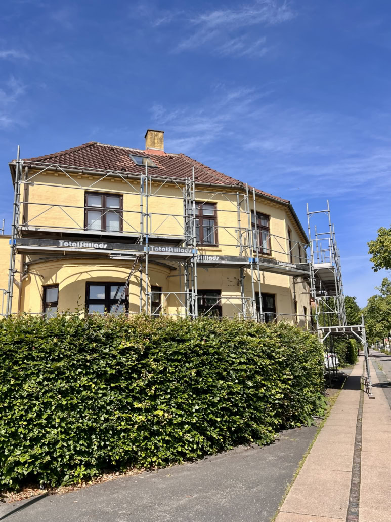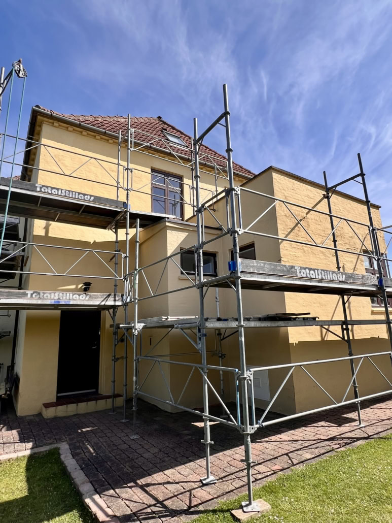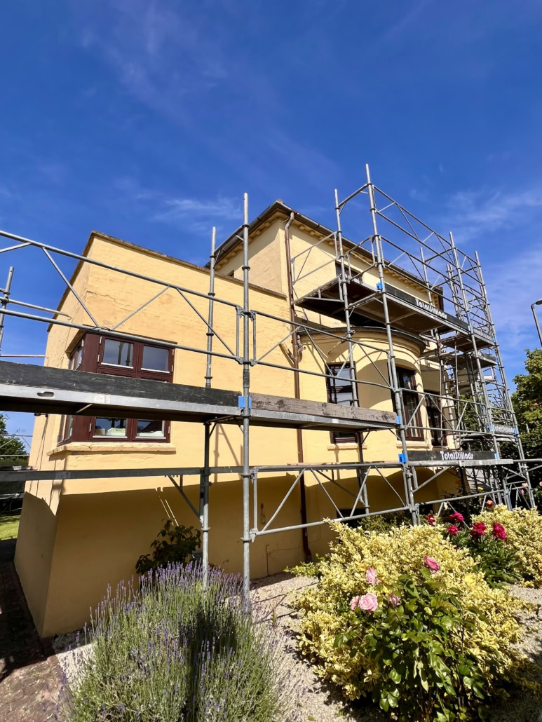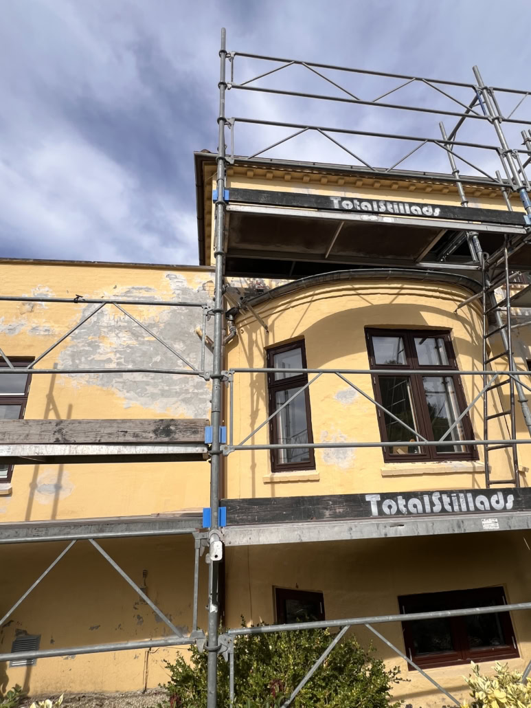 Arbejdet er udført fra stillads leveret af vores mange gode samarbejdspartner. Resultatet er en flot, robust facade, klar til mange års vind og vejr.